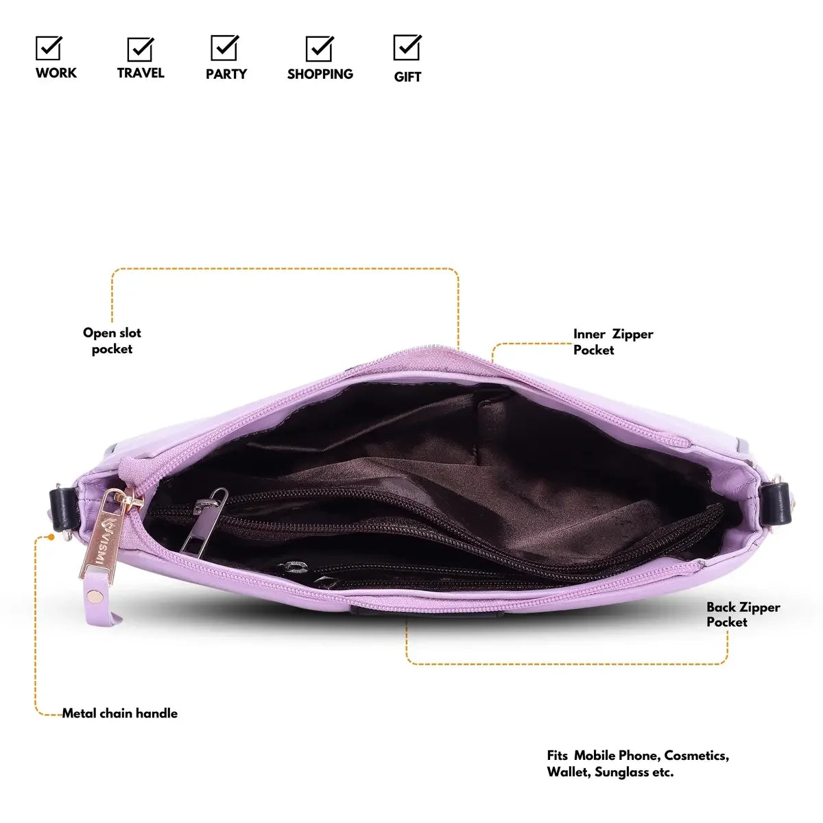 The bag offers a well-thought-out design to keep your essentials organized. The main compartment holds everything you need, while an inner zipper pocket provides a secure space for valuables. Two inside slit pockets make it easy to organize smaller accessories, and the zipper separator pocket ensures you have extra room for additional items while keeping everything neat and easily accessible.